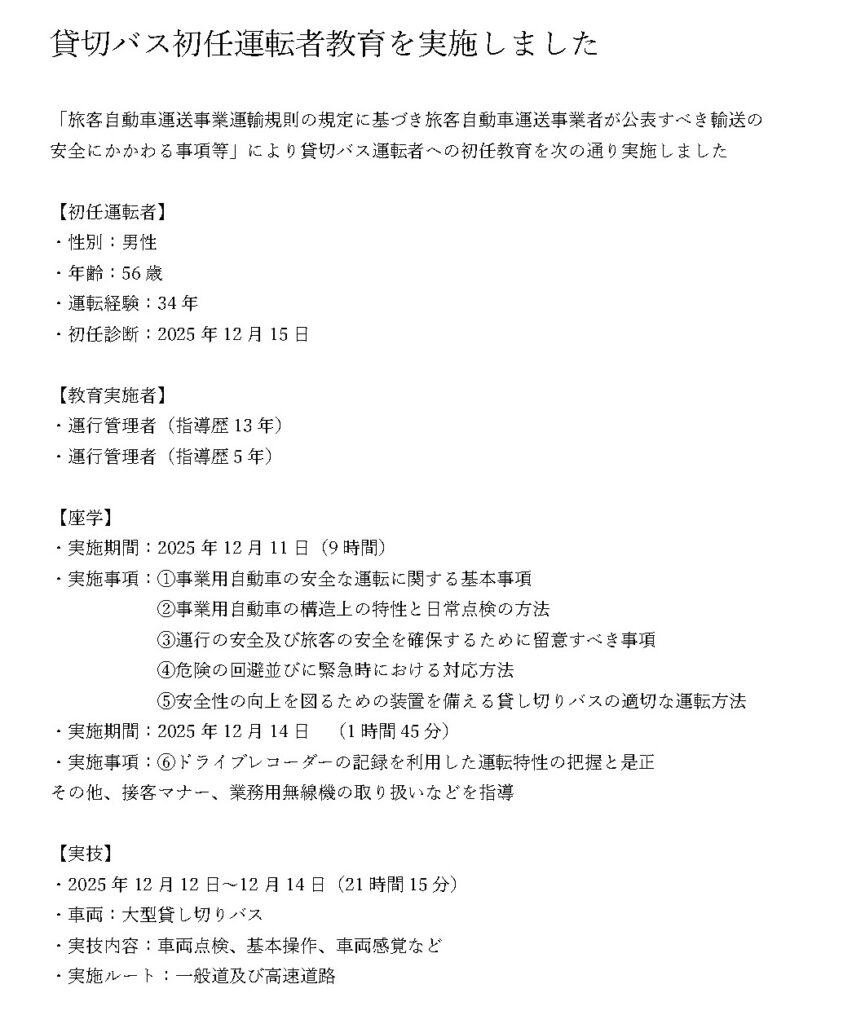 2026年1月19日 / 最終更新日時 : 2026年1月19日 kikuchi 会社情報 貸切りバス初任運転者教育を実施しました ※画像は講習イメージです FacebookXHatenaPocketCopy
